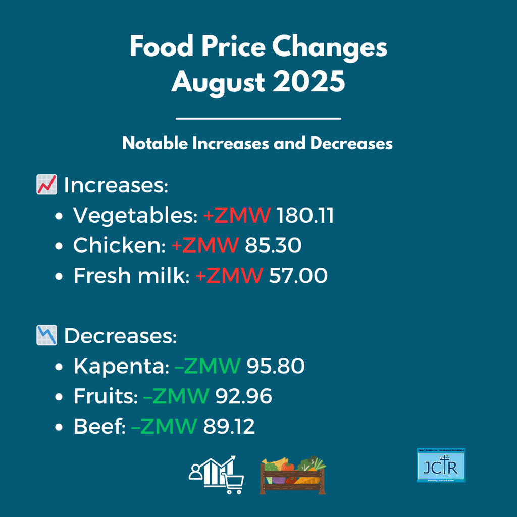 Lusaka, Zambia – The Jesuit Centre for Theological Reflection (JCTR) August 2025 Basic Needs and Nutrition Basket (BNNB) for Lusaka for a family of five stood at ZMW 11,432.17, dropping from ZMW 11,602.45 in July and representing a reduction of ZMW 170.28. This decline was driven primarily by a notable decrease in the cost of essential non-food items, which fell by ZMW 154.10, while the cost of basic essential food items saw a marginal reduction of ZMW 16.18. Among food commodities, there were some significant price increases in vegetables (increased by ZMW 180.11), chicken (increased by ZMW 85.30), and fresh milk (increased by ZMW 57.00). Conversely, the largest decreases were recorded in the prices of kapenta (down by ZMW 95.80), other fruits (down by ZMW 92.96), and beef (down by ZMW 89.12). Under the non-food items section, the price of a 90kg bag of charcoal decreased by ZMW 76.67. These shifts reflect ongoing volatility in both food and non-food commodities, underscoring the need for continued monitoring of household affordability, particularly in urban areas.