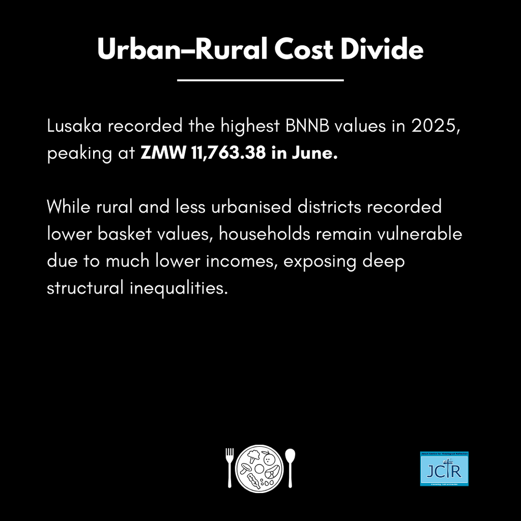 As 2026 began, JCTR reviewed key trends from the 2025 BNNB across selected districts. At the district level, Lusaka consistently recorded the highest basket values throughout the year compared to other districts. The Lusaka BNNB rose from ZMW 10,800.56 in January to a peak of ZMW 11,763.38 in June, before standing at ZMW 11,327.98 in December. These high basket values reflected the combined impact of elevated food prices, housing costs, transport, and energy expenses associated with urban living, conditions that continue to erode the dignity of households struggling to meet their basic needs.