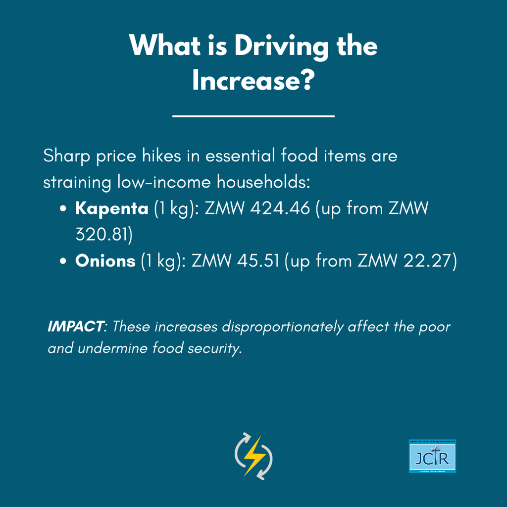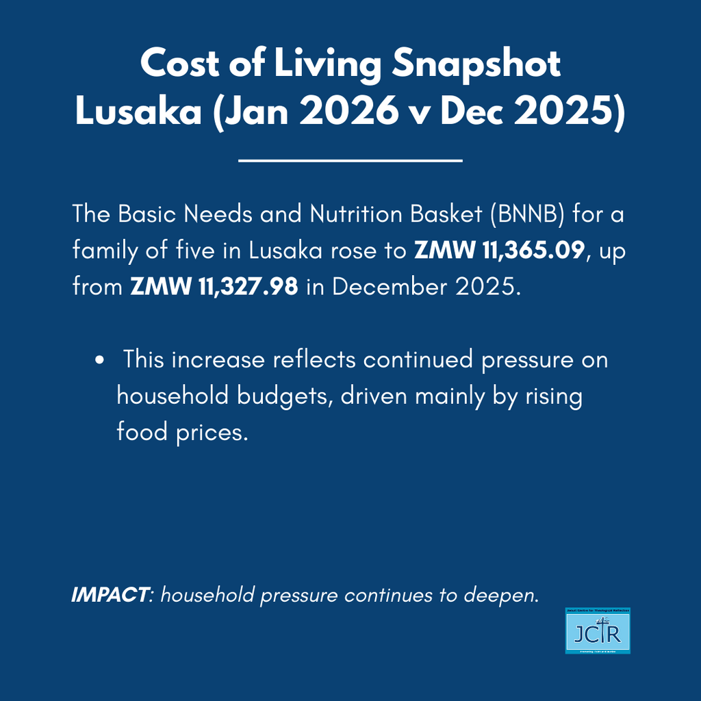 Lusaka, Zambia – The Jesuit Centre for Theological Reflection (JCTR) Basic Needs and Nutrition Basket (BNNB) for a family of five in Lusaka increased to ZMW 11,365.09 from ZMW 11,327.98 in December 2025. This rise was largely driven by sharp increases in the cost of essential food items: 1 kg of kapenta, rose to ZMW 424.46 from ZMW 320.81, and 1 kg of onions increased to ZMW 45.51 from ZMW 22.27. Such price increases disproportionately burden low-income households, underscoring the need for a deliberate option for the poor in economic and food pricing policies.